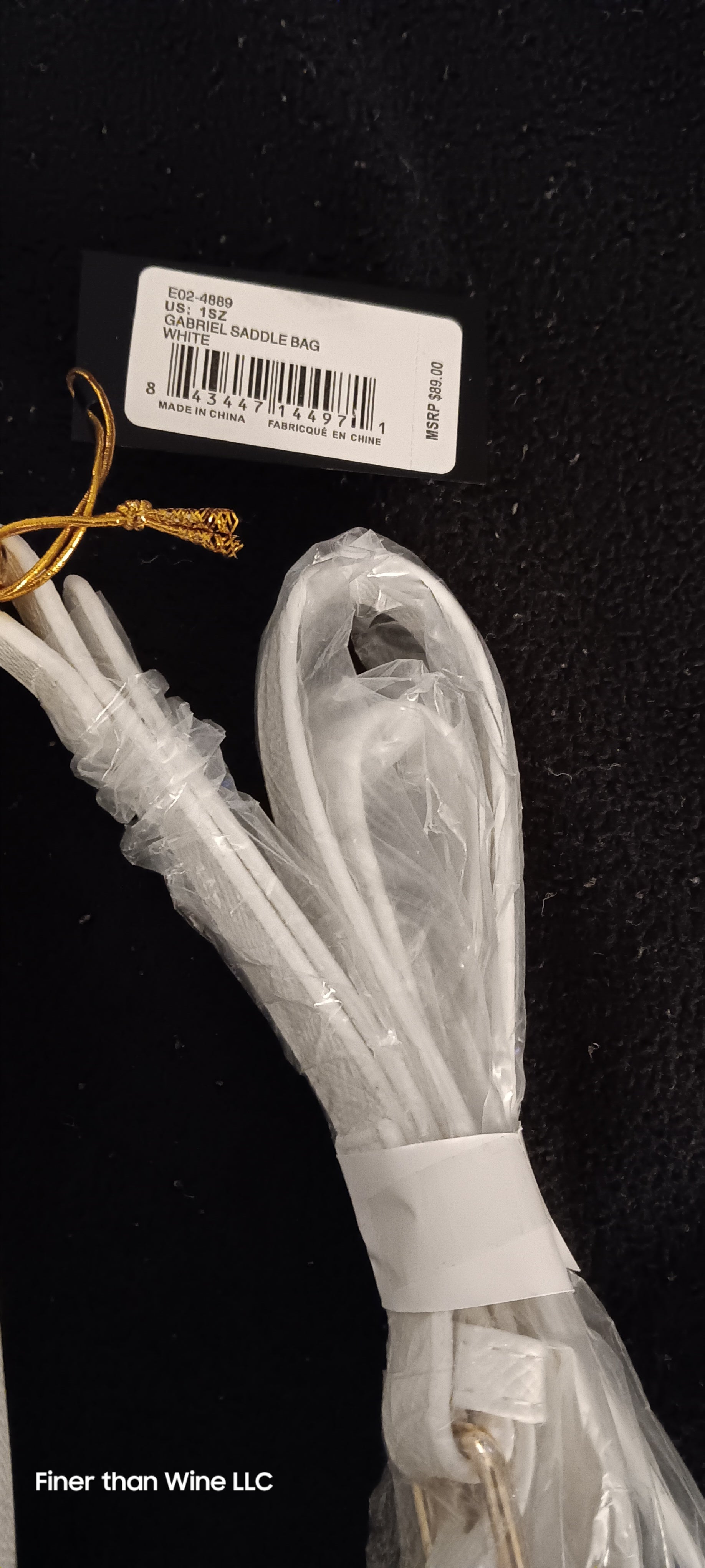 New With tags. Bebe Gabriel Saddle Crossbody white purse. Gold Bebe logo flap closure. Adjustable strap. Inside zipper pocket
