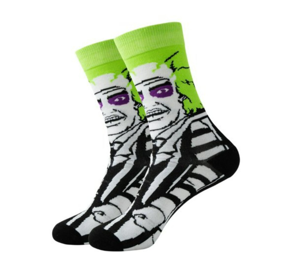 Experience the quirky and playful style of Beetlejuice with our unisex socks! These socks add a unique touch to any outfit while keeping your feet comfy. A must-have for any Beetlejuice fan! OS fits most.